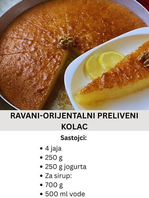 Kada probate RAVANI, zaboravićete na baklave i tulumbe: Najbolji orijentalni preliveni kolač; Ako želite nešto baš slatko, a pritom i jednostavno, isprobajte recept za tradicionalni ravani kolač. Sastav: 4 jaja 250 g šećera 250 g jogurta 100 g putera…