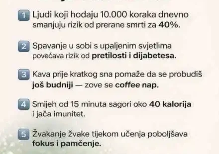 U svijetu zdravlja i dobrog osjećaja često se pojavljuju savjeti koji zvuče nevjerovatno. Međutim, mnoge od ovih “šokantnih” činjenica zapravo imaju naučnu osnovu. Evo šest intrigantnih tvrdnji koje bi mogle promijeniti vaše dnevne navike. 10.000 Koraka…