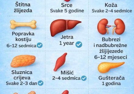 Moždano/nervno tkivo Traje 1–12 godina Neke od najsporijih regeneracija, ali da, dešava se – posebno u hipokampusu!Srce Regeneriše se svakih 4,5–5 godina Iako se srčane ćelije sporo regenerišu, jednom se vremenom zamjenjuju – vaš otkucaj srca ima…
