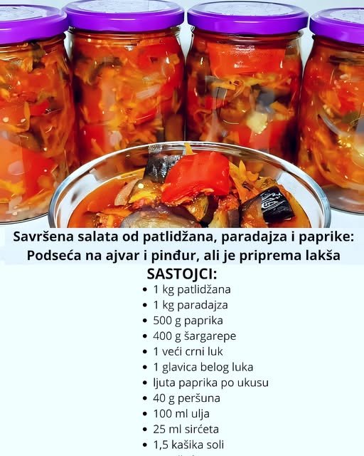 Savršena salata od patlidžana, paradajza i paprike. Podseća na ajvar i pinđur, ali je priprema lakša. Sastojci: 1 kg patlidžana 1 kg paradajza 500 g paprika 400 g šargarepe 1 veći crni luk 1 glavica belog luka ljuta paprika po ukusu 40 g peršuna 100 ml…