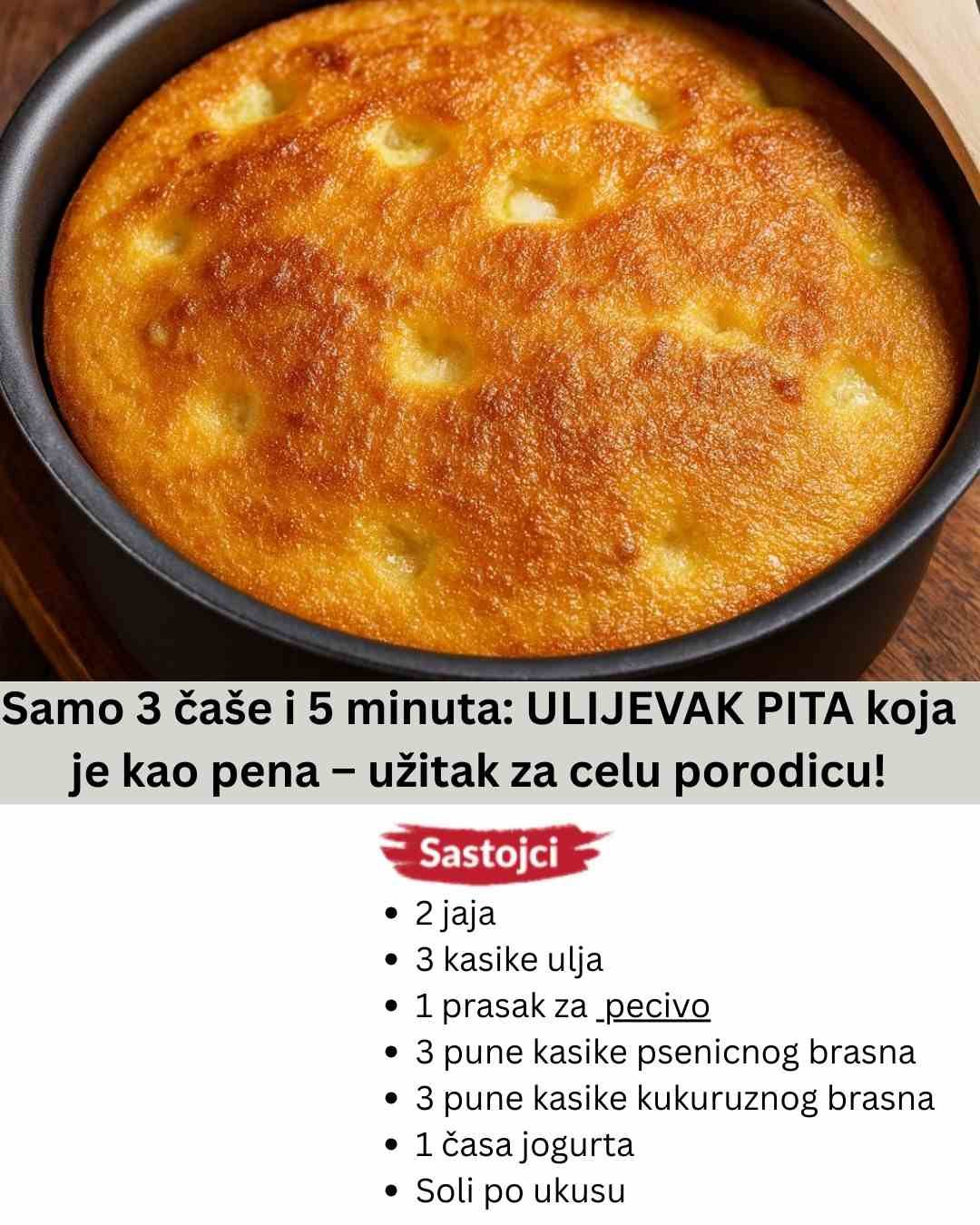 Оvo se pravi brzinom munje! Sjajna pita koja svima uspije. Sastojci: 2 jaja 3 kasike ulja 1 prasak za pecivo 3 pune kasike psenicnog brasna 3 pune kasike kukuruznog brasna 1 časa jogurta Soli po ukusu PRIPREMU POGLEDAJTE U VIDEU ISPOD REKLAMA DOLE:…