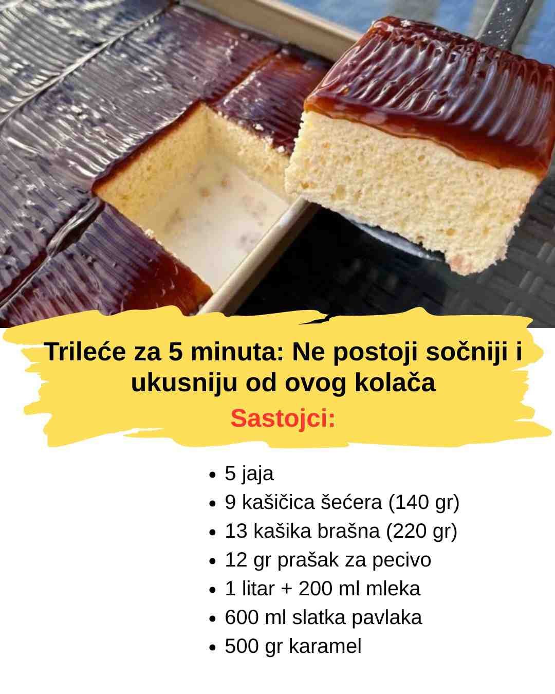 Trileće za 5 minuta po receptu koji ćete upamtiti već pri prvom pravljenju! Sastojci: 5 jaja 9 kašičica šećera (140 gr) 13 kašika brašna (220 gr) 12 gr prašak za pecivo 1 litar + 200 ml mleka 600 ml slatka pavlaka 500 gr karamel Priprema: Jaja i šećer…