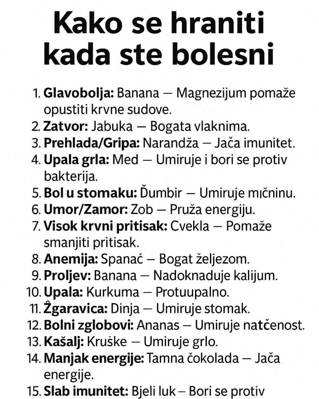 1️⃣ Glavobolja – Banana: bogata magnezijem koji pomaže opuštanju krvnih sudova i ublažava napetost. 2️⃣ Zatvor – Jabuka: sadrži puno vlakana koja podržavaju zdravu probavu i olakšavaju pražnjenje crijeva. 3️⃣ Prehlada ili grip – Narandže: bogate…
