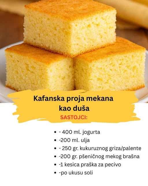 Kafanska proja fenomenalnog ukusa. Mekana kao duša. Sastojci: – 3 jajeta – 350 gr. sira – 400 ml. jogurta – 200 ml. ulja – 250 gr. kukuruznog griza/palente – 200 gr. pšeničnog mekog brašna – 1 kesica praška za pecivo – po ukusu soli…