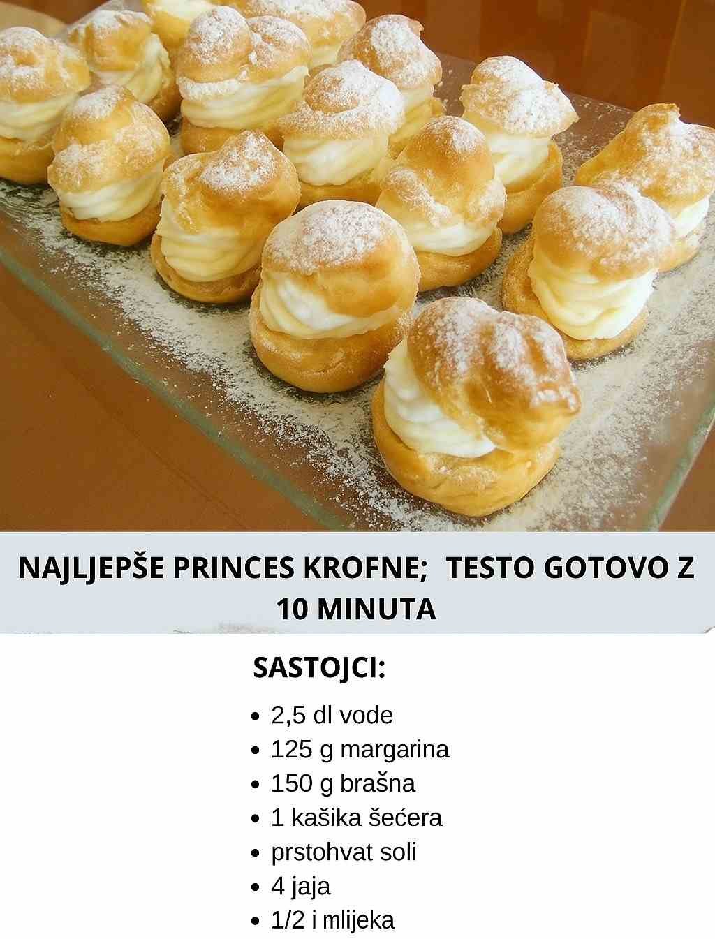 TESTO GOTOVO ZA 10 MINUTA NAJLJEPŠE PRINCES KROFNE Sastojci za testo: 2,5 dl vode 125 g margarina 150 g brašna 1 kašika šećera prstohvat soli 4 jaja Sastojci za kremu: 1/2 l mleka 250 g šećera 2 žumanca 4 kašike gustina 2 kesice vanilin šećera 125 g…