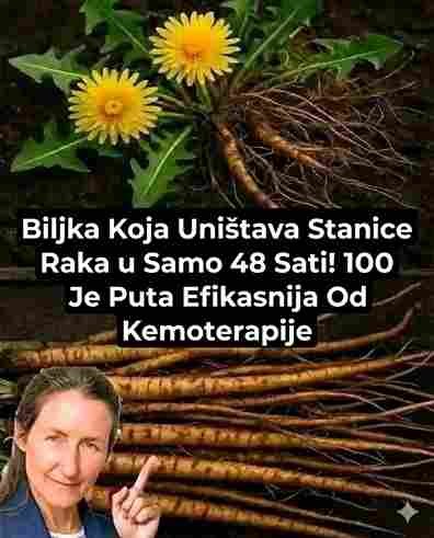Slika koja kruži internetom iznosi hrabru tvrdnju o običnom korovu: da korijen maslačka može uništiti ćelije raka za samo 48 sati i da je 100 puta efikasniji od kemoterapije. Na slici je prikazana žena koja pokazuje na iskopano korijenje maslačka ispod teksta koji obećava čudesne rezultate.