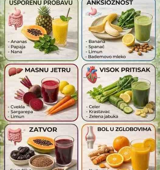 U današnjem brzom svijetu, mnogi ljudi se okreću prirodnim rješenjima kako bi podržali svoje zdravlje. Svježi sokovi od voća i povrća jedan su od najlakših i najefikasnijih načina za njegu tijela. Slika ističe nekoliko kombinacija sokova koje mogu pomoći u podršci različitim aspektima zdravlja.