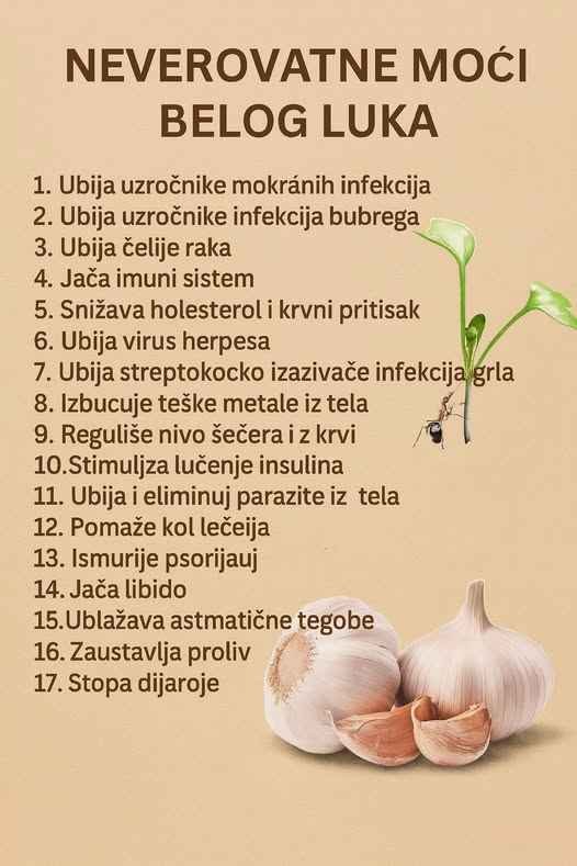 Beli luk je jednostavna, jeftina i izuzetno moćna biljka koju bi svako trebao imati u svojoj prehrani. Bilo da se koristi svjež, u čaju ili kao dodatak jelima, on predstavlja čudesan prirodni lijek za jačanje zdravlja i prevenciju mnogih bolesti.