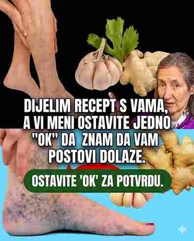 Na drugoj slici vidimo dramatičan prikaz nogu pogođenih proširenim venama, gdje je koža tamna zbog lošeg protoka krvi. Strelica koja vodi od bolne noge ka bijelom luku i đumbiru simbolizira put ka ozdravljenju. Ovi sastojci nisu samo hrana; oni su funkcionalni lijekovi koji direktno utiču na viskoznost krvi.