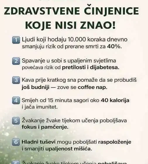 Zdravlje često nije u velikim, dramatičnim promjenama, već u malim, dosljednim navikama koje imaju dubok utjecaj. Ove “šokantne” činjenice podsjećaju nas da je naše tijelo izuzetno osjetljiv i povezan sistem, a male promjene mogu donesti velike rezultate. Probajte implementirati jednu ili dvije od ovih naučno potkrijepljenih navika i posmatrajte kako se osjećate.